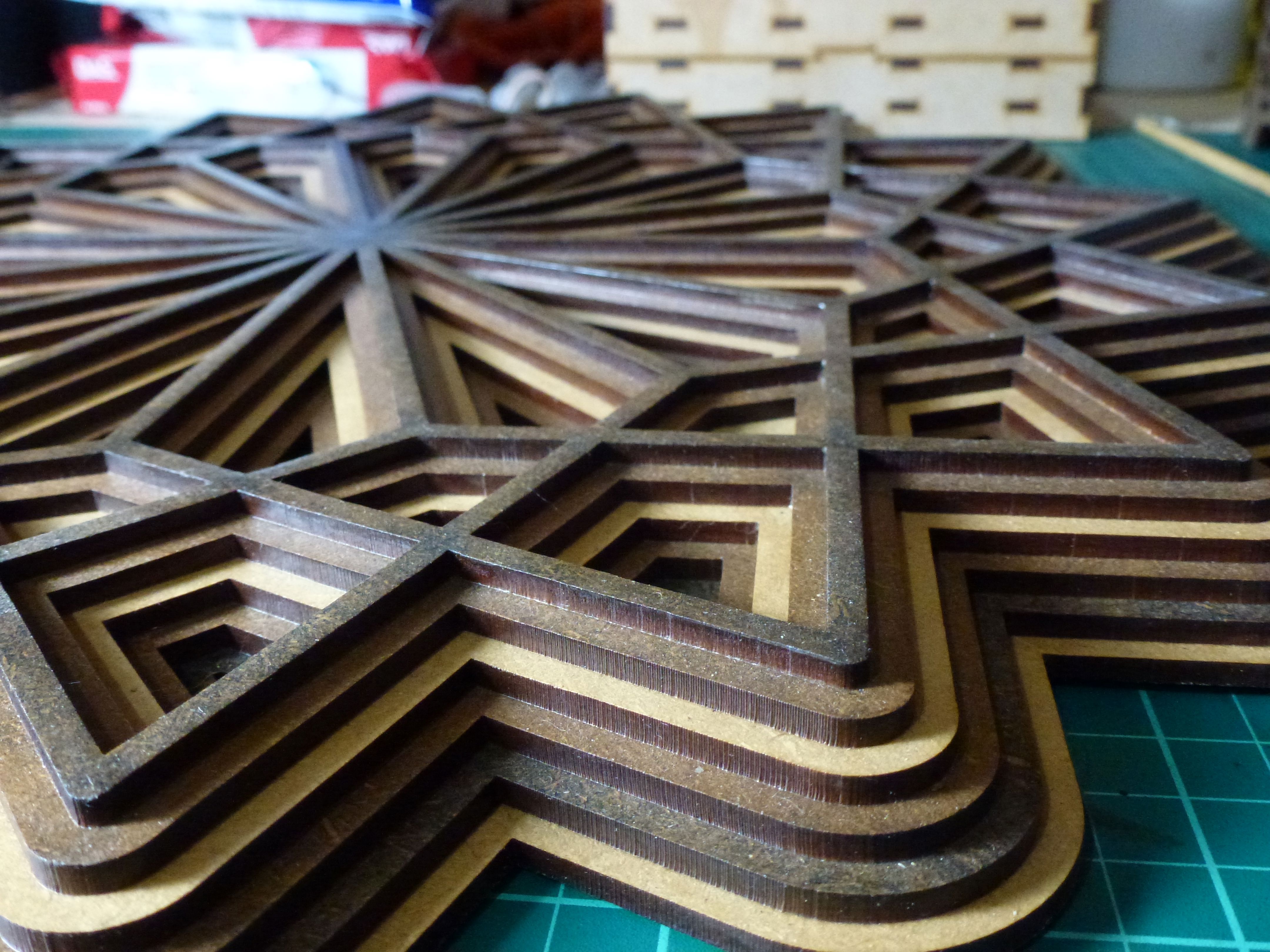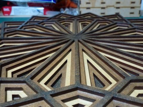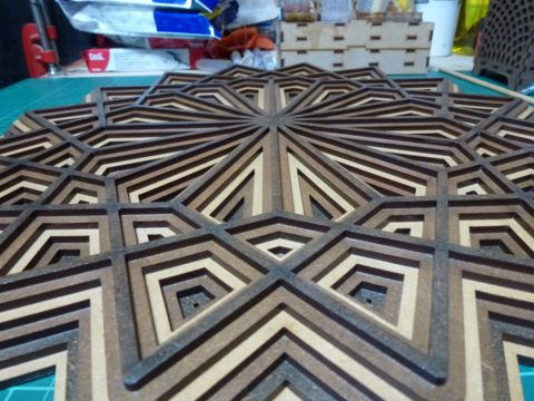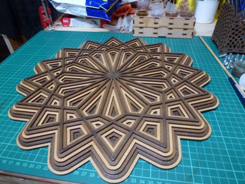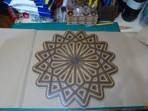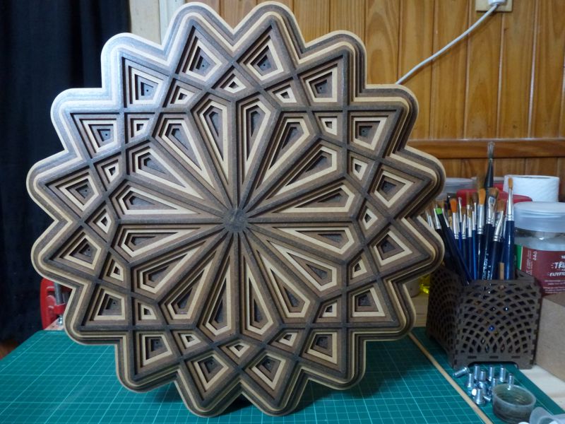 Construido en MDF de 3mm en 6 capas con un diametro de 38cm. Pintado con tinta para madera en colores naturales y terminado con barniz acrilico.